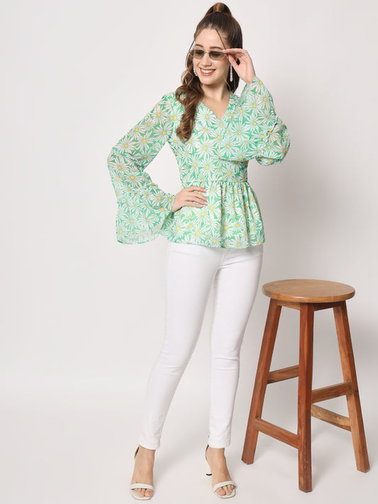 Floral Printed Bell Sleeves V-Neck Pleated Cinched Waist Top