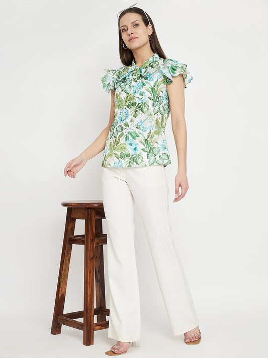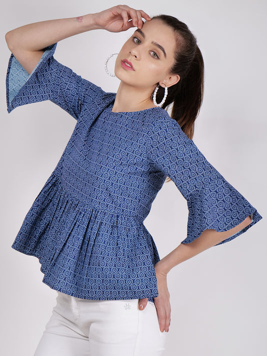 Printed Tie-Up Neck Three-Quarter Sleeve Pleated Kurit