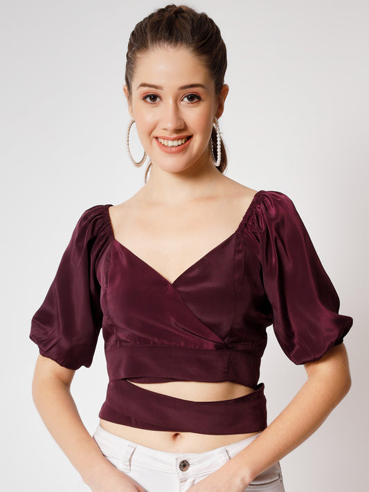 Puff Sleeves Crepe Cut Out Wrap Crop Top