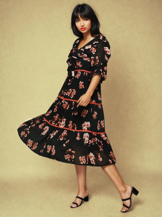 Floral Print Georgette V-Neck Puff Sleeves Opaque Fit & Flare Midi Dress