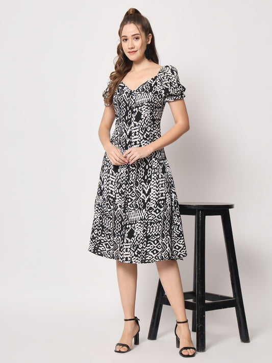 V-Neck Puff Sleeves Abstract Printed Fit & Flare Dress