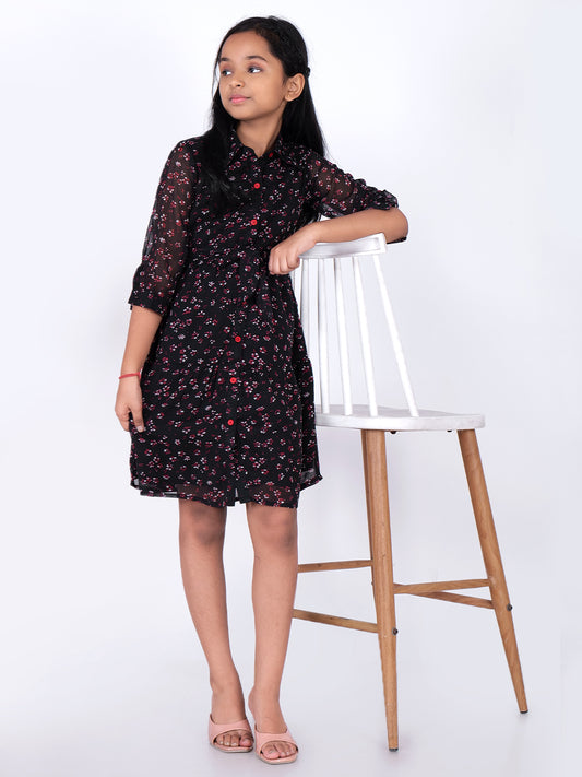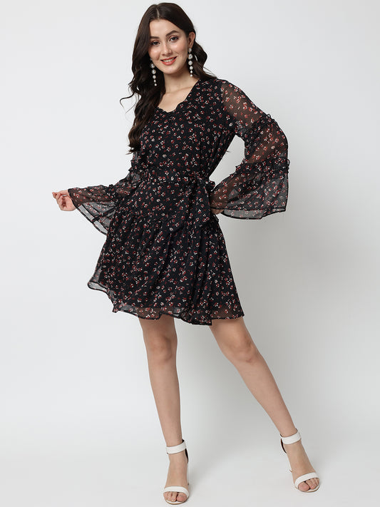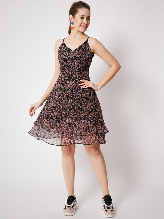 Floral Printed Layered Georgette Fit & Flare Dress