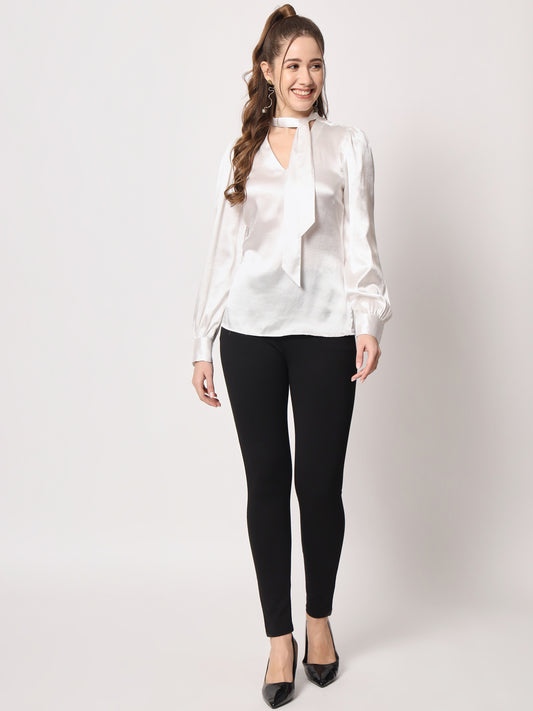 Tie-Up Neck Cuffed Sleeves Satin Top