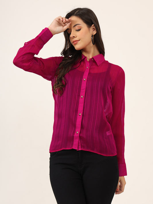 Women Vertical Stripes Semi Sheer Pink Shirt