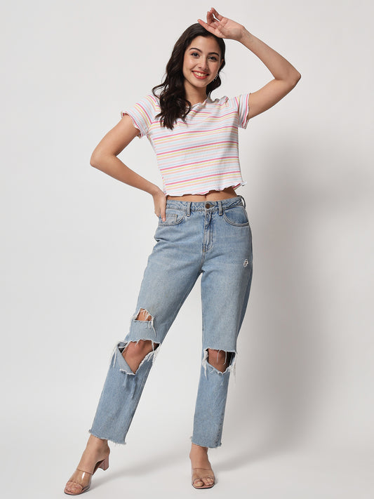 Women White & Yellow Striped Organic Cotton Crop Top