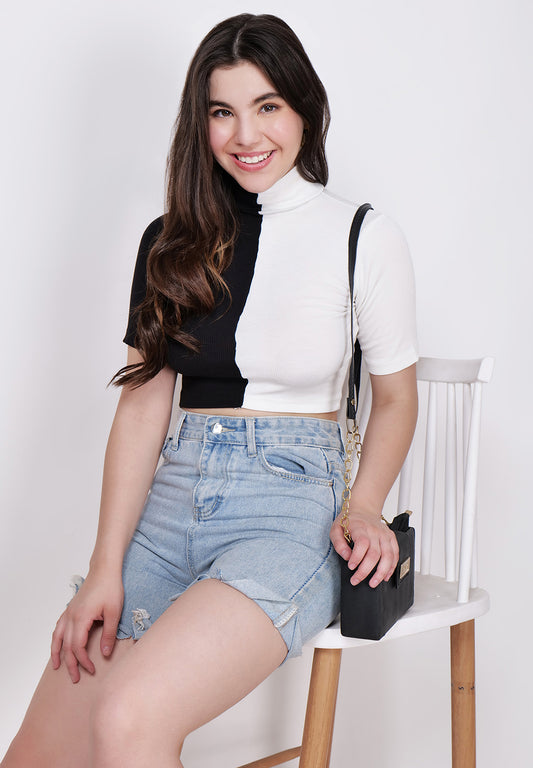 Women White & Black High Neck Fitted Crop Top