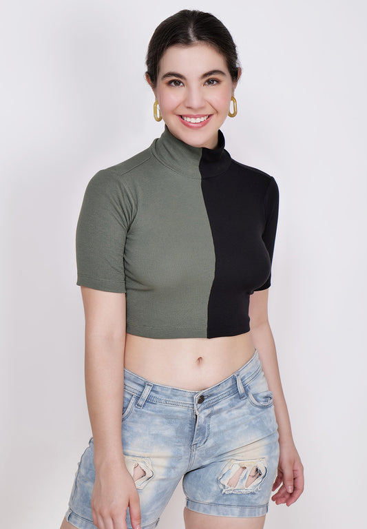 Women Olive & Black High Neck Fitted Crop Top