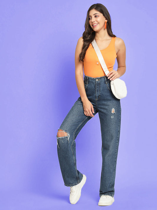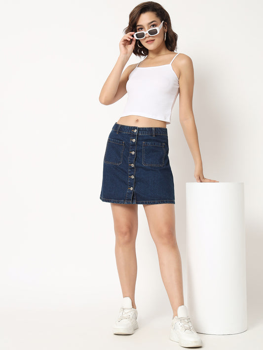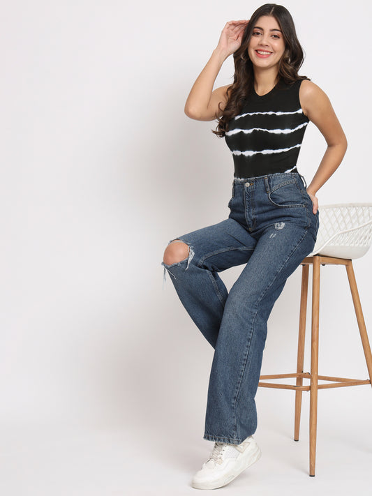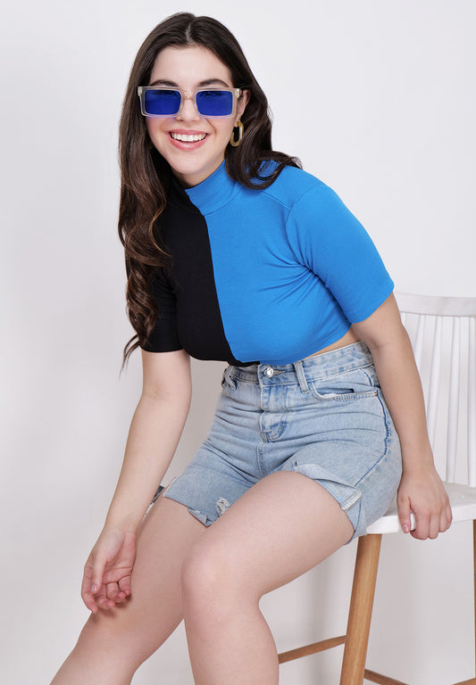 Women Blue & Black High Neck Fitted Crop Top