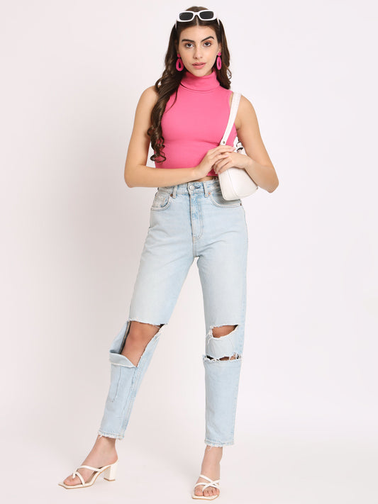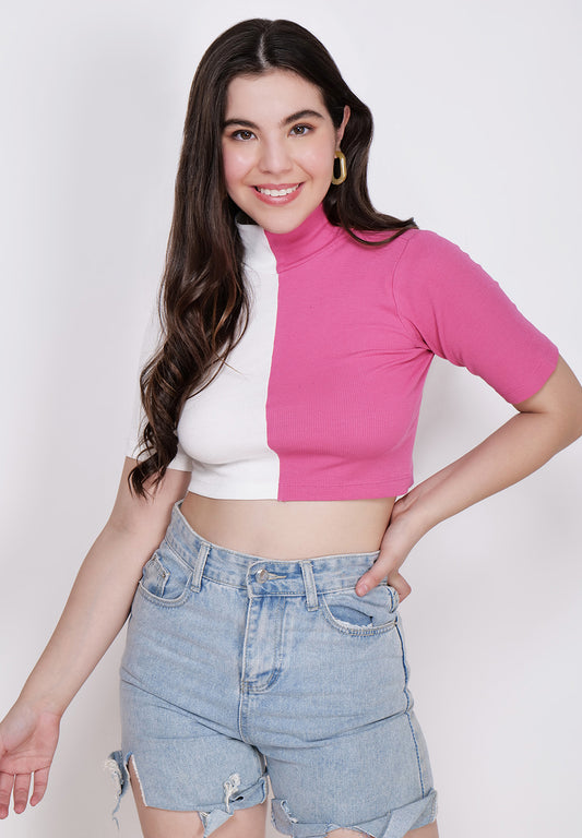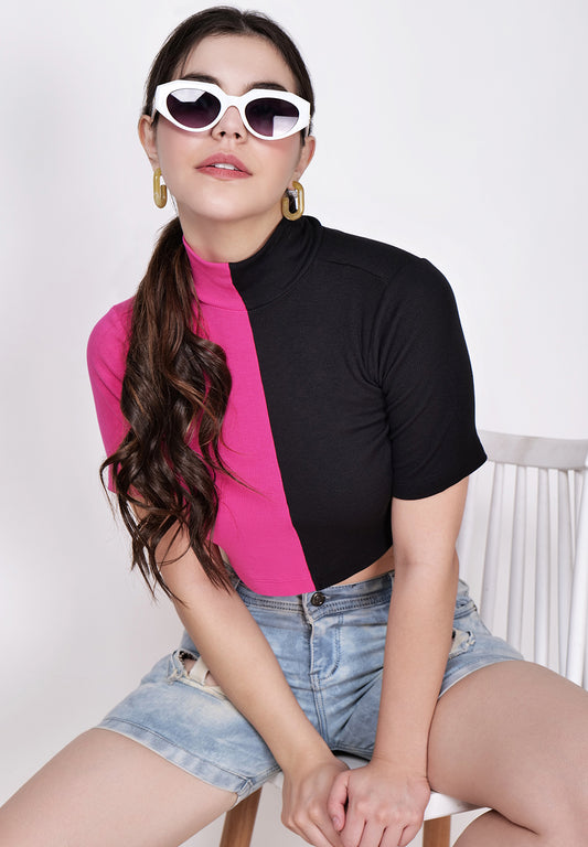 Women Pink & Black High Neck Fitted Crop Top