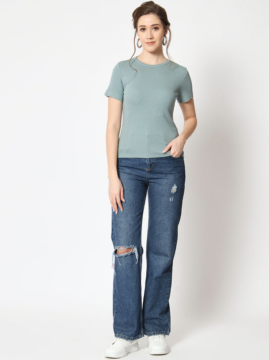 66% OFFRibbed Round Neck Fitted Top
