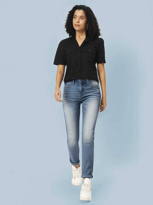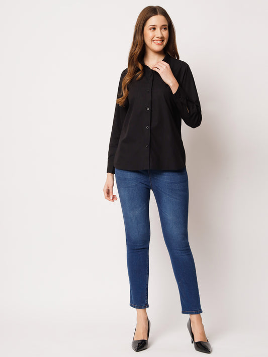 Women Classic Slim Fit Cotton Black Crop Shirt