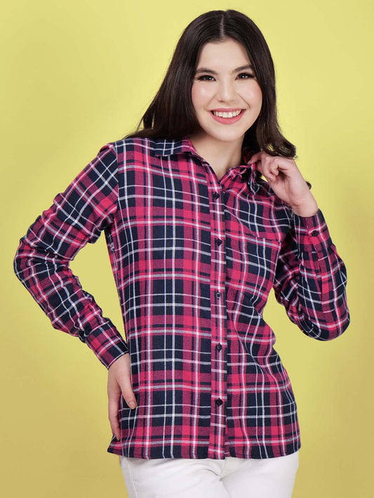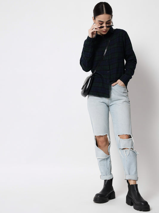 Women Navy Blue & Green Regular Fit Tartan Checked Pure Cotton Casual Shirt