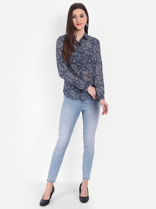 Women Blue & White Relaxed Semi Sheer Paisley Printed Casual Shirt