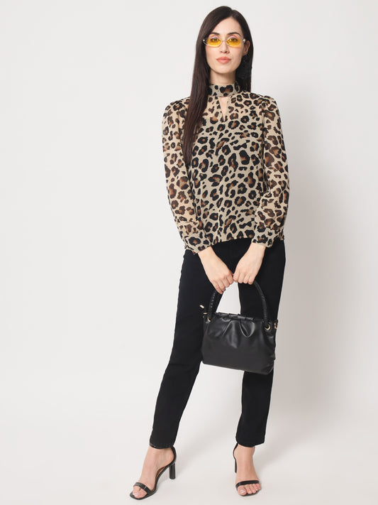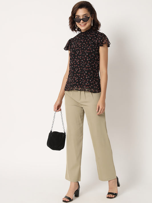Mandarin Collar Flutter Sleeve Crepe Shirt Style Top