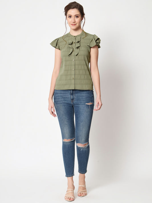 Horizontal Striped Flutter Sleeves Ruffled Shirt Style Top