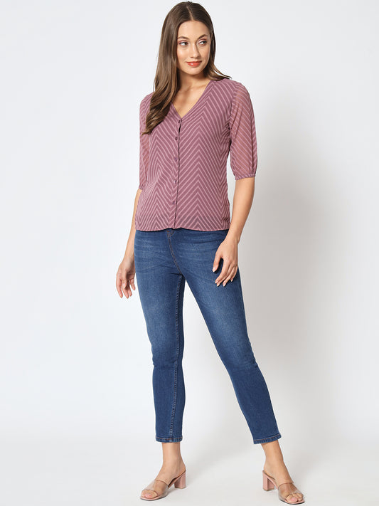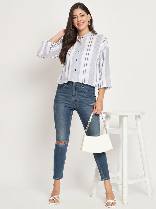 Women's Blue Striped Mandarin Collar Shirt Style Top