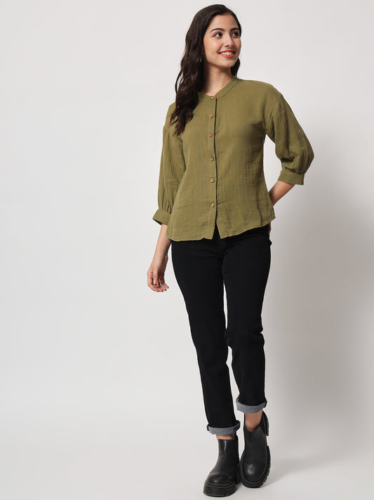 Mandarin Collar Cuffed Sleeves Cotton Shirt Style Top