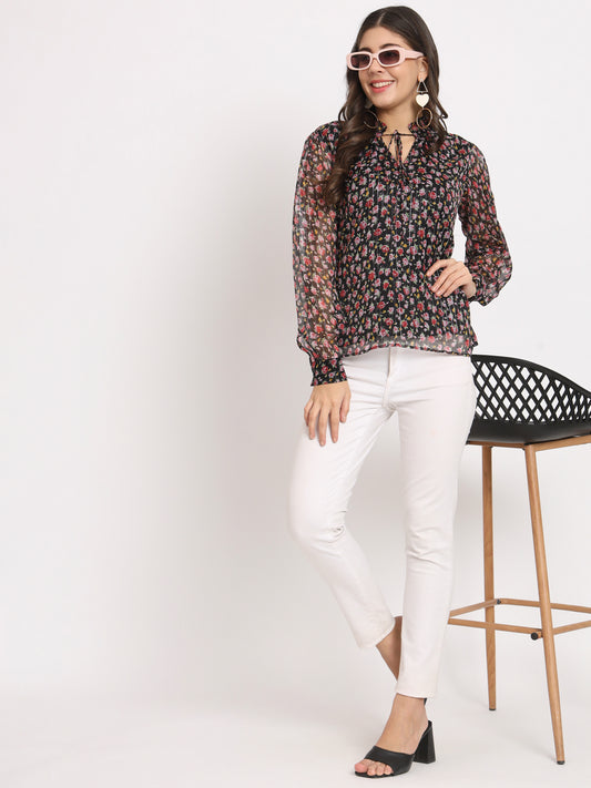 Women Floral Print Georgette Black Top